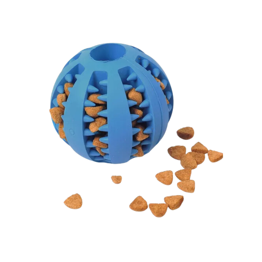 Pelota de goma resistente para acompañarla con alimento de la mascota.